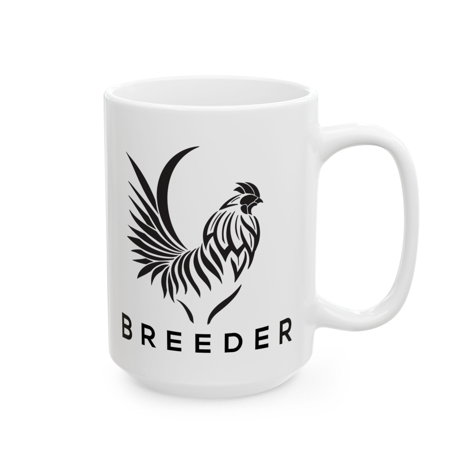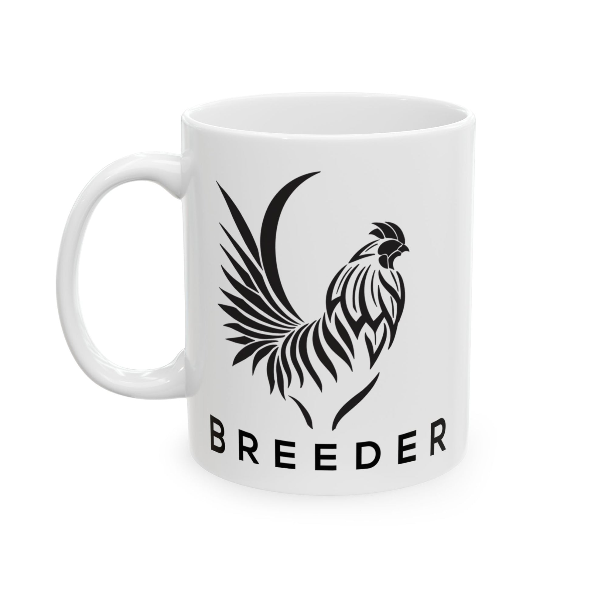Raise your banner with every sip. This Crisp Ceramic mug with it's comfortable C handle features a bold, stylized rooster and the word BREEDER in clean, unapologetic type. It’s the perfect mix of heritage grit and modern swagger, made for early risers, night grinders, barnstormers, and anyone who builds greatness from the ground up.